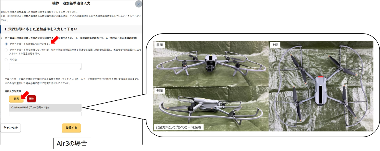Air3の場合は先のリストに含まれないので「プロペラガードを装備して飛行させる。」にチェックを入れた上で「資料及び写真等」下部の「選択」をクリック、プロペラガード装着状態のAir3の機体写真を添付して「登録する」をクリックします。