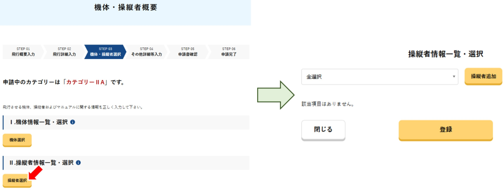 機体・操縦者概要に戻ったら「Ⅱ.操縦者情報一覧・選択」の欄にある「操縦者一覧」をクリックすると「操縦者情報選択・一覧」というウインドウが展開します。