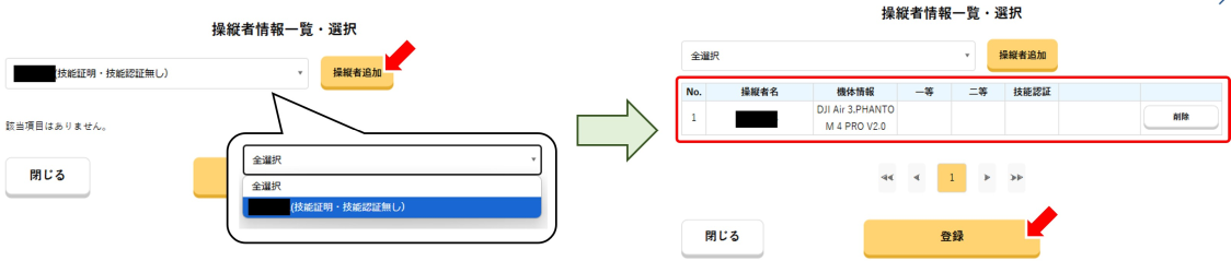 筆者の名前をクリックして選択した状態で、右側にある「操縦者追加」ボタンをクリックし、操縦者として登録します。