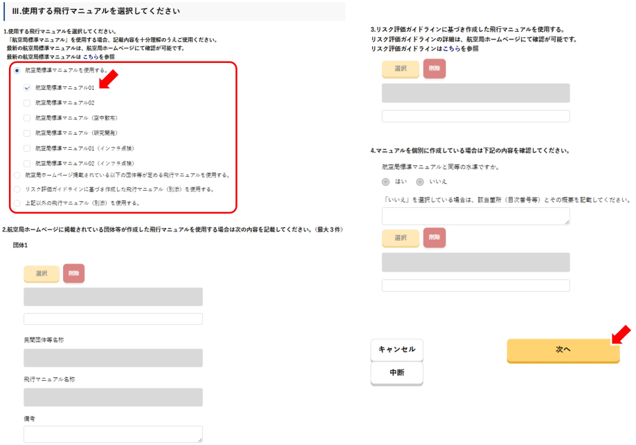 機体・操縦者情報の登録が完了したら「Ⅲ.使用する飛行マニュアルを選択してください」の欄に移動します。