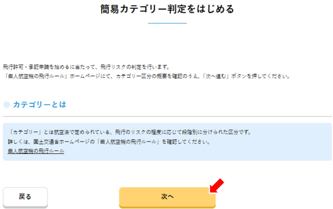 飛行許可・承認メニューの「飛行許可・承認の申請書を作成する」の欄から「新規申請」をクリックします。「簡易カテゴリー判定をはじめる」というページが開くので「次へ」をクリックし、カテゴリー判定に必要な設問に答えていきます。