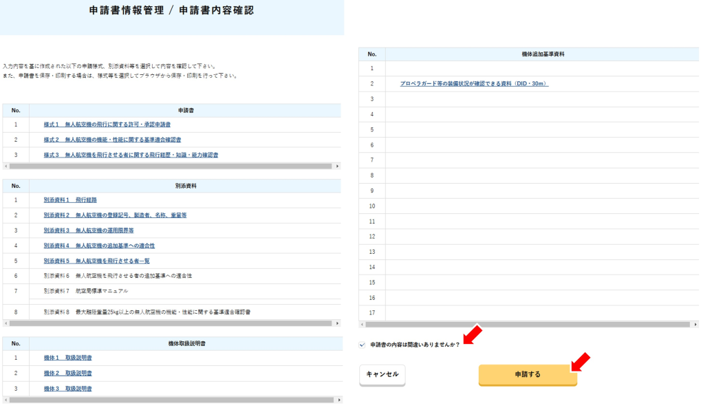 各ページで入力した内容を元に申請用の様式へと編集されたドキュメント類を確認できます。内容に間違いがないことが確認できたら、ページ下部「申請書の内容は間違いありませんか?」にチェックを入れ「申請する」をクリックして飛行申請を行います。