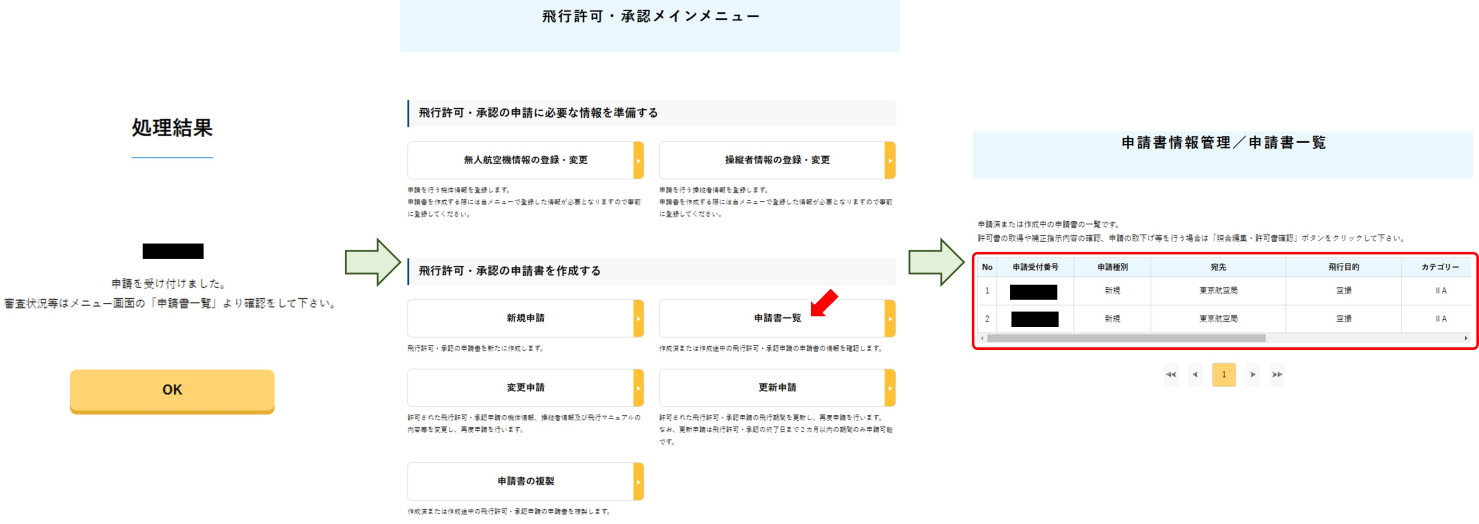 以降、申請については飛行許可・申請メインメニューの「申請書一覧」から表示することができます。