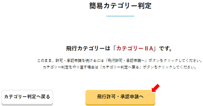 全て選択が完了後に「次へ」をクリックすると、簡易カテゴリー判定の結果が表示されます。「飛行許可・承認申請へ」をクリックして、当該申請の概要を記入する画面に移ります。