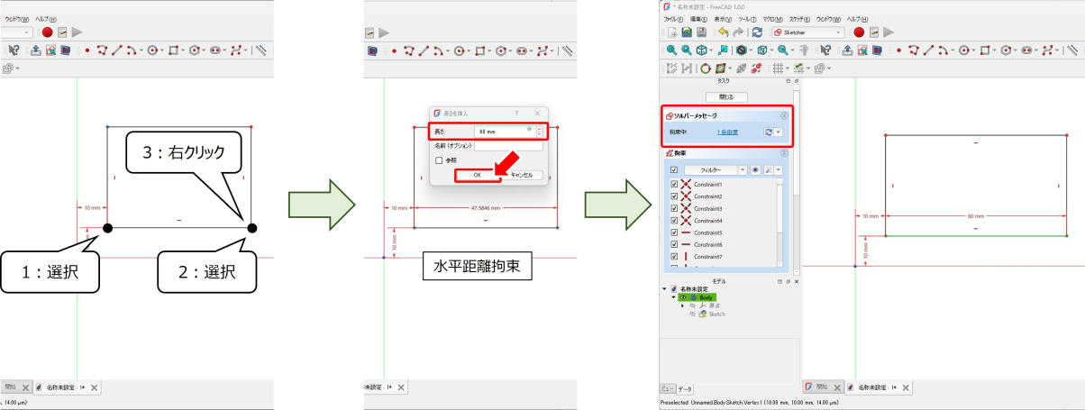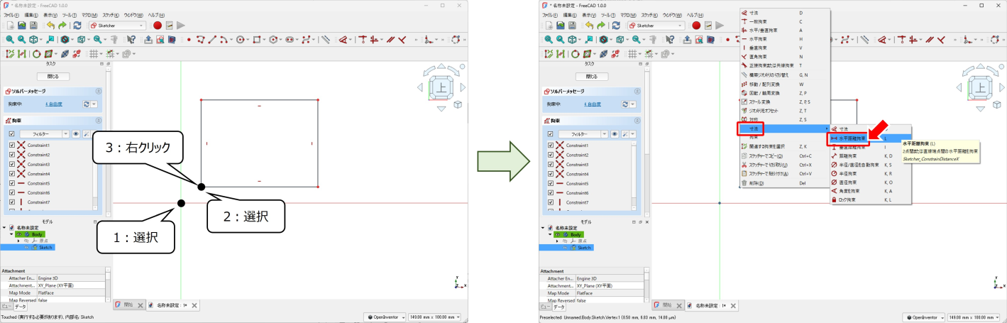 まずは横に隣り合う2つの頂点を選択し、右クリックメニューから「水平距離拘束」をクリックします。