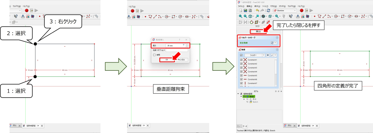 最後の垂直距離拘束により、四角形の縦横の辺の長さも指定できました。これまでの作業によりソルバーメッセージが「完全拘束」となり、四角形の位置と各部寸法が完全に定義できました。
