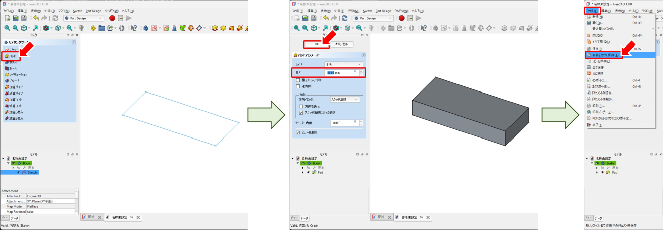 モデリングツールから「パッド」をクリックし、パッドパラメーター内の長さはデフォルトの「10 mm」のまま「OK」をクリックします。