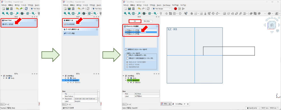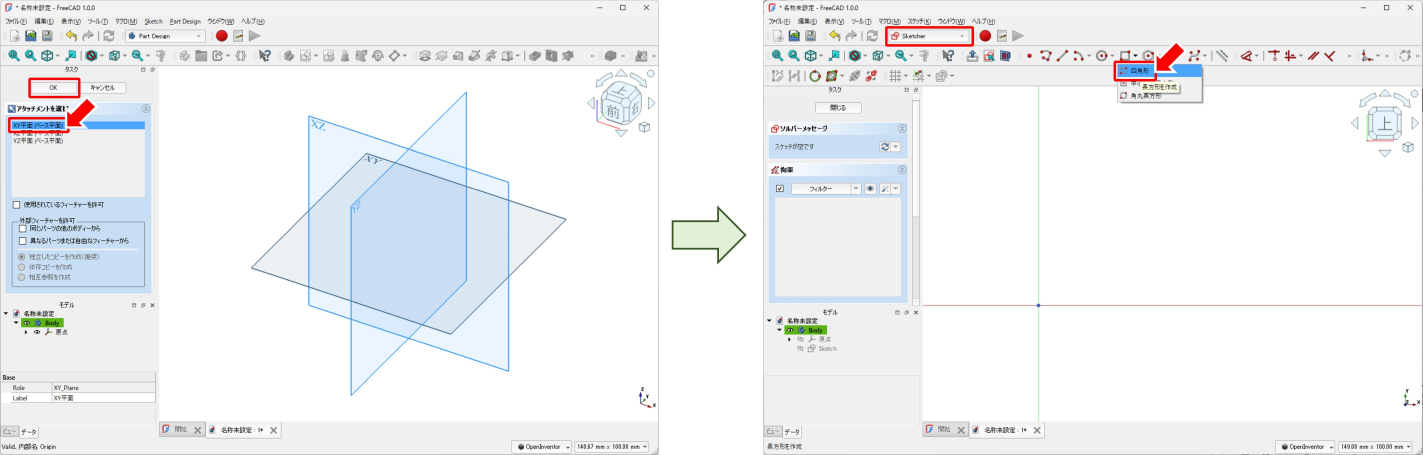 それでは設計を進めていきます。以前のバージョンではワークベンチと呼ばれる箇所の切り替えから始めましたが、今回はデフォルトで「Part Desigin」となっていたので、画面左側タスク欄にある「スケッチを作成」をクリックし、どの平面上にスケッチを作成するか決めます。