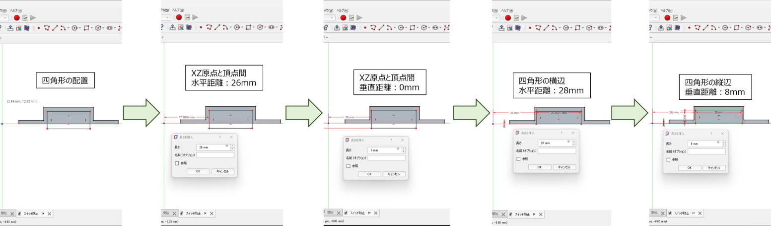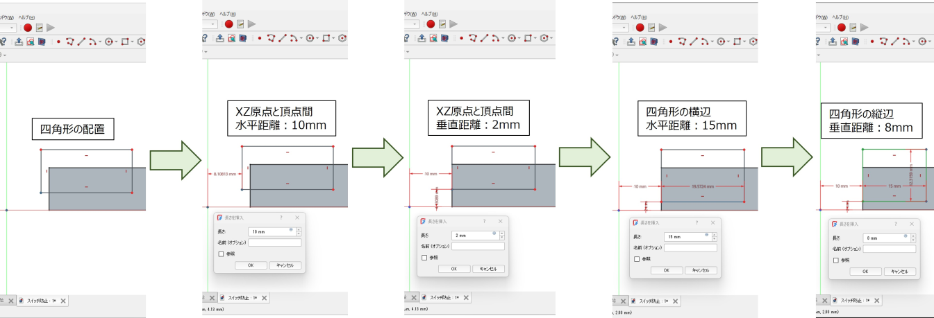 スケッチによる四角形の配置、頂点間の水平・垂直距離拘束を行う手順は先程と全く同じです。