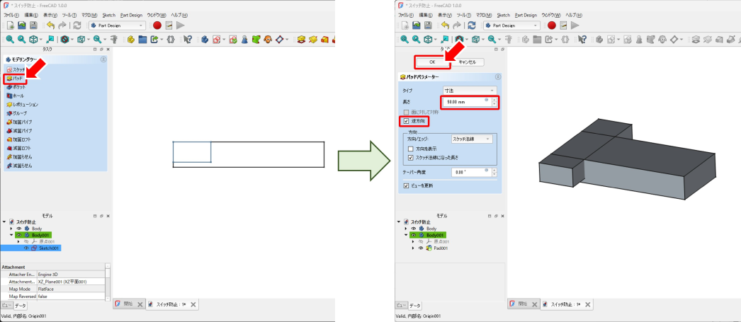 モデリングツールから「パッド」をクリックし、パッドパラメーター内の「逆方向」にチェックを入れた状態で、長さ「50 mm」を指定し「OK」をクリックします。