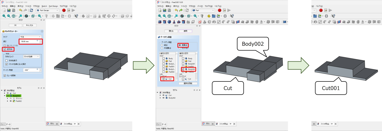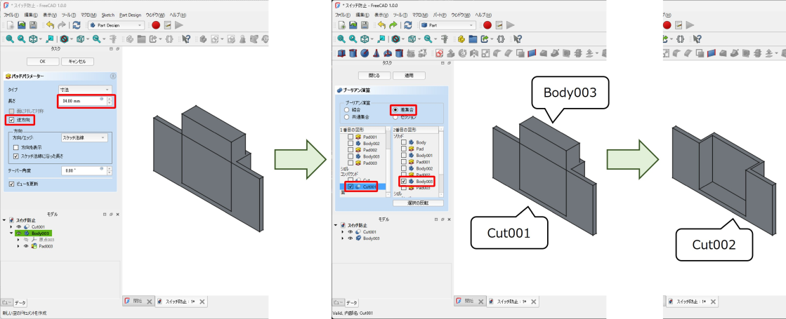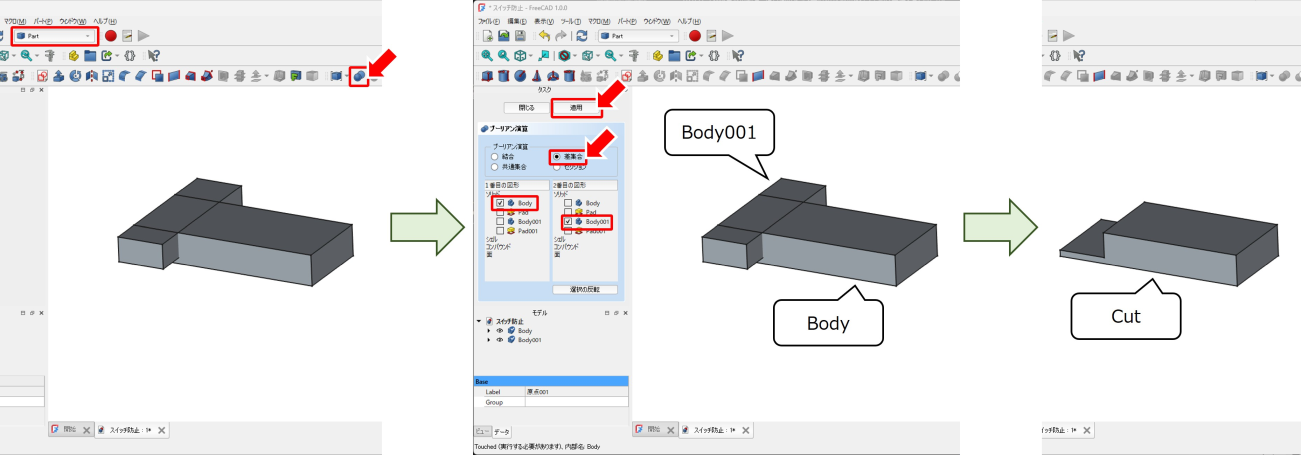 ブーリアン演算については少々注意で「差集合」のブーリアン演算を行うことは同じなのですが、1番目の図形として先程のブーリアン演算によって得られた立体「Cut」を、2番目の図形に3個目に作った立体である「Body002」を選択します。