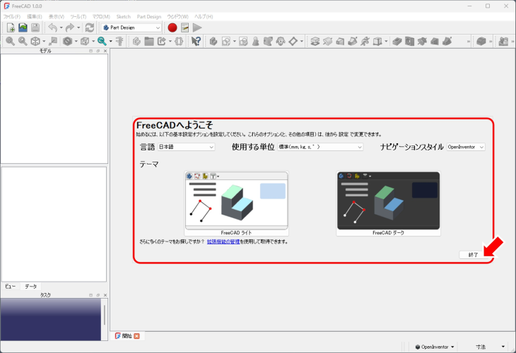 インストールが完了したらFreeCADを起動し、初回起動時は基本設定オプションについて指示を求められるので、好みの項目を選択し「終了」をクリックします。