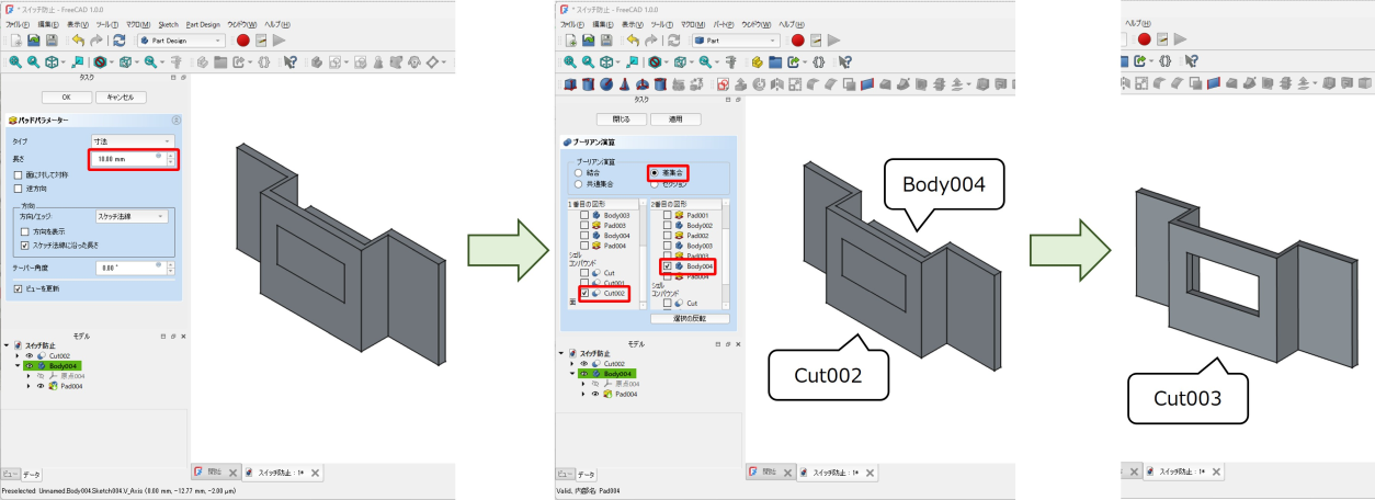 ブーリアン演算は毎度おなじみ「差集合」を選択し、1番目の図形として「Cut002」を、2番目の図形に「Body004」を選択します。