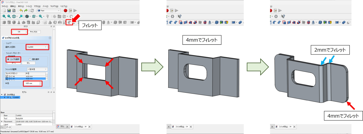 選択した図形を「Cut003」に、選択範囲を「エッジを選択」とし、先程設けた操作用の穴の四隅に対して半径「4 mm」でフィレットを設定します。視点をぐりぐり回しながらエッジを選択し「OK」を押すと、選択したエッジに対して指定した半径のカーブが掛かります。