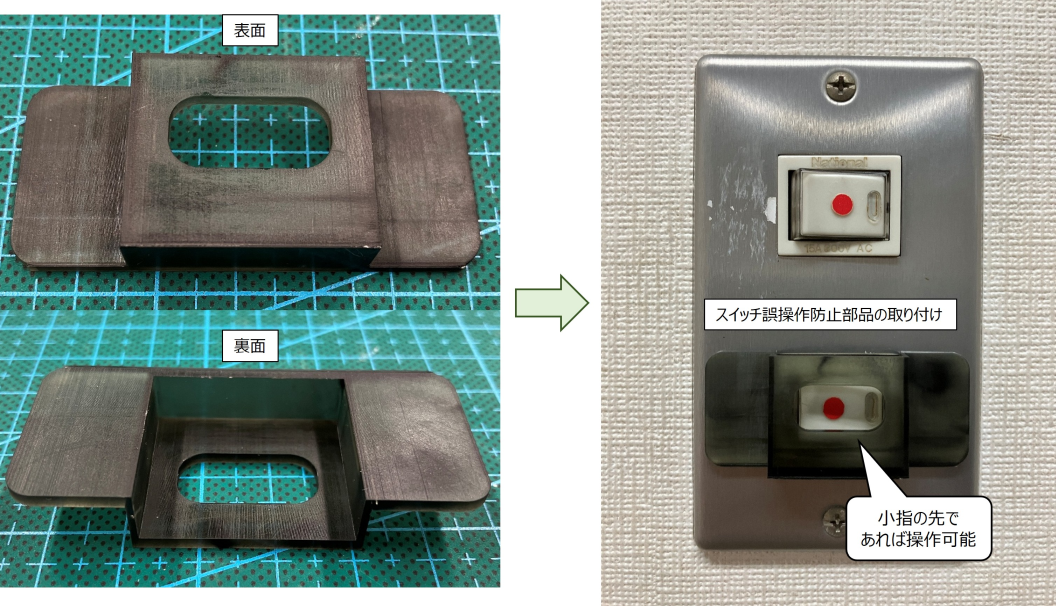 その対策として、通常指が触れた程度ではスイッチが押せないようなカバーを作ってスイッチに被せ、換気扇を止めないようにします。完全に操作できないのも不便ですので、小指の先やボールペンでスイッチを押せるように操作用の穴を設けて、流れ作業での誤操作を防止します。