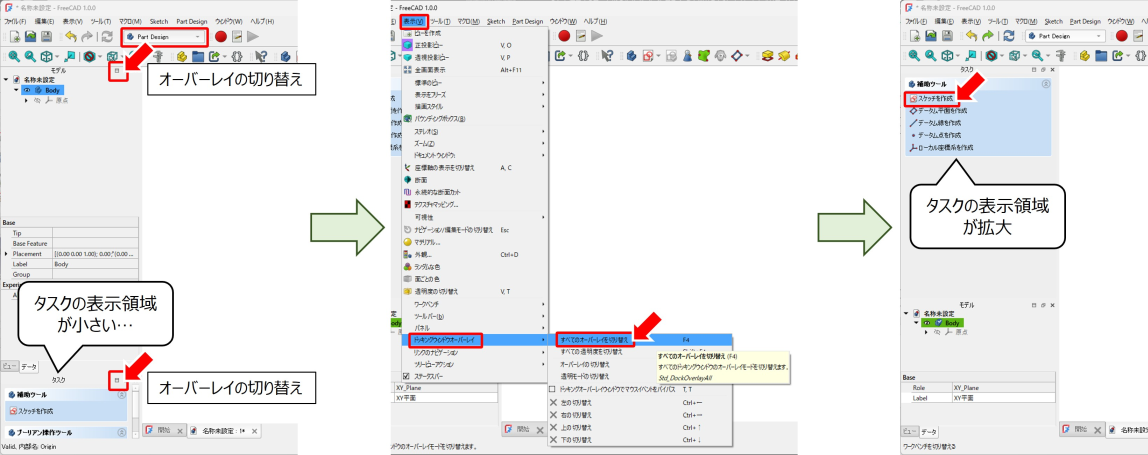 この際、タスクの表示領域が非常に小さく扱いづらいため「オーバーレイの切り替え」やメニューバーの表示からドッキングオーバーレイの項目にカーソルを移動し「全てのオーバーレイの切り替え」をクリックして表示領域を調整しました。ただ、何度か操作した後に現在の表示になったので、どの順番で操作したのかわからずです……