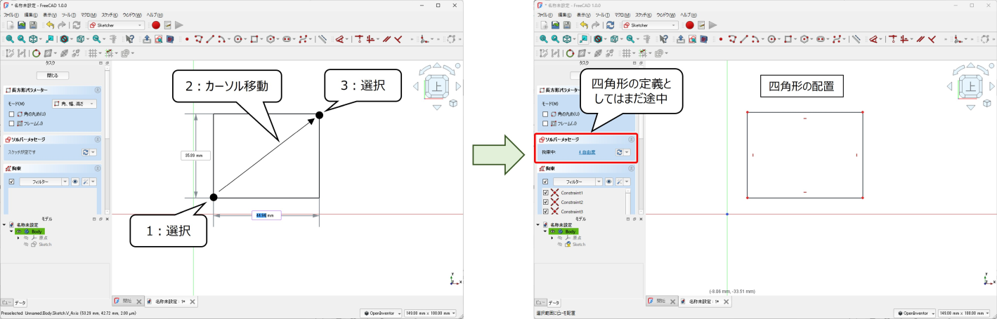 ソルバーメッセージについても「1 自由度」となり、残る一箇所を指定すれば四角形の定義が完了します。
