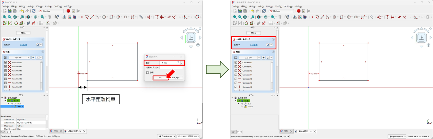これで、XY平面の原点に対して水平距離で10mmの位置に四角形の頂点が存在することが定義できました。ソルバーメッセージも「3 自由度」となり、定義しなければならない寸法が1箇所指定できたことがわかります。