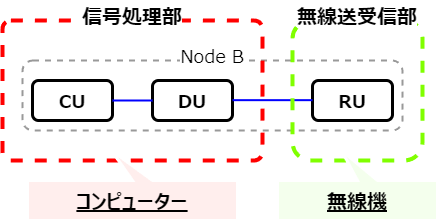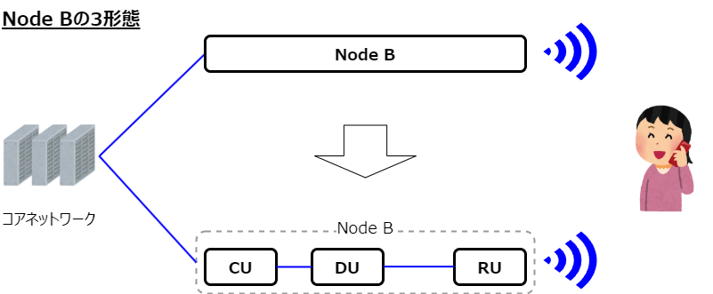 B: で、さらに面倒くさくて申し訳ないんだけど、携帯電話の世代が上がる毎に、Node Bが細分化されてるんだ。もともとNode Bは一つのハードウエアだったんだけど、CDMA後期やLTEの時は、Node BはBBUとRRHの2つに分かれて、5GではCU、DU、RUという3つに分かれた。いや、分かれたというのは正確じゃない。分けても良くなった、ということだ。