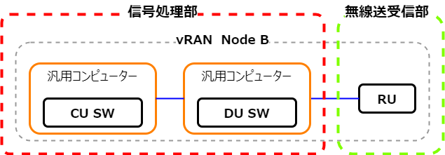 B: でも、最近の汎用コンピュータはもの凄く高速になってきた。だから、ASICを積んだ専用ハードウエアでなくても、Node Bの信号処理ができるようになってきた。つまり、汎用コンピュータ上で走るソフトウエアでNode Bを実現できるようになったということ。尚、ソフトウエアで動くNode Bを「vRAN」、日本語で「RAN仮想化」と呼ぶようになった。