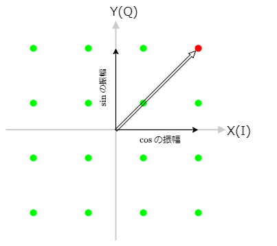 この図、通信を勉強したことのある人なら、必ず見たことがある図だと思います。先ほども書いたとおり、cosとsinの振幅、つまり横軸と縦軸の値に情報が載るため、結果としてコンステレーション図上の点の位置が、送信データとなります。図1は16QAMという方式の図です。16QAMでは、2つの振幅を使って16個の点から1つを選ぶようになっています。16個の点にはそれぞれ0~15までの番号が振られていて、振幅が指し示した位置の”点の番号”がデータになるわけです。(ちなみに、0~15なので4ビットのデータとなります。)
