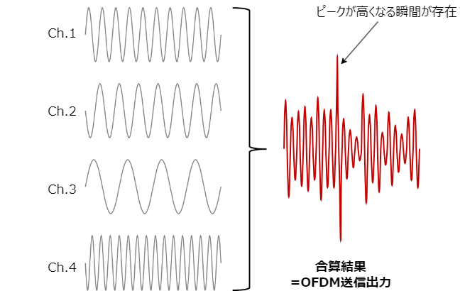 各チャンネルの波形は送信データにより異なるため、その合算結果であるOFDM送信波形はランダムです。ですから、当然その振幅もランダムになります。小さい振幅の時もあれば、大きい振幅の時もあります。これは、確率の問題です。例えば、10個のサイコロを同時に振ったときの合計値を考えてみましょう。サイコロの期待値は3.5ですから、何千回、何万回と試行した場合の合計値の平均は3.5×10でおよそ35になるはずです。ですが、各試行を見てみると、1x10で計10の可能性もあるし、6x10で計60になるときもあるでしょう。OFDMの振幅も同じです。全部の波形を足してみると、振幅が0になる瞬間もありますし、全部の波のを足した最大値になる瞬間もあるでしょう。