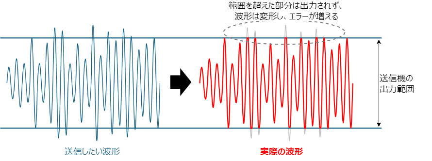 そんな振幅の大小に対応するために、OFDMの送信機は非常に高性能なものが使われます。しかし、それでも一定以上の振幅になってしまうと、送信機が出力できる範囲を超え、超えてしまった部分は欠損し、送信できません。当然、送りたい波形が変わってしまうため、エラーにもなってしまいます。一般的にそれをクリッピングと呼んでいます。