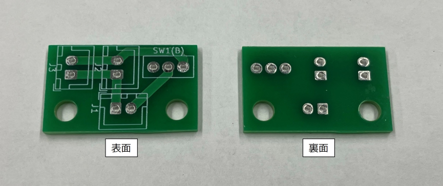 裏面シルクプリント代を削って表面に「SW1(B)」として記載したスライドスイッチは裏面側に、コネクター3個は表面側にはんだ付けします。はんだ付けについては過去記事でコツを紹介していますので、苦手な方がいましたら、そちらもチェックしていただけると幸いです。