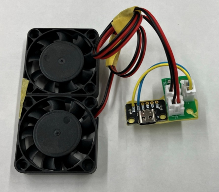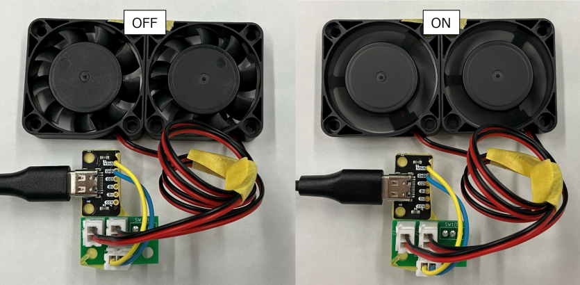 それでは、別途用意したACアダプターとUSB Type-CケーブルをUSB基板に接続し、DCファンを駆動させてみます。