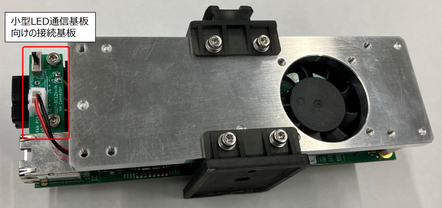 光無線区間の検証用として、常時最大負荷で稼働させ続けるために設計・製造しました。ファン用の電力は、LED通信基板に供給するDC12Vを分岐させて供給しています。