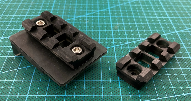 光造形の水洗いレジンで作っているので、強度的に重いスコープの取付けには不安が残りますが、軽いレーザーサイト程度であれば全く問題なしです。レールの角も土台より出っ張っているオーバーハングとなっていますが、角度が45度のためサポートいらずで目立った変形もなく造形できました。