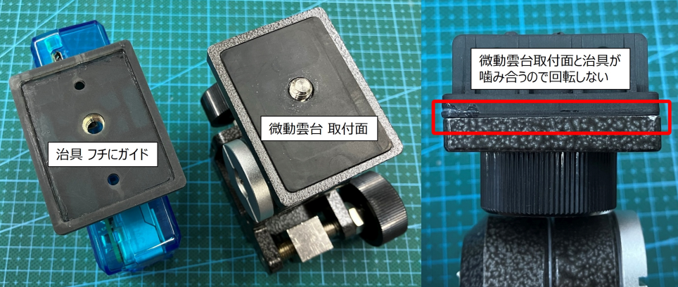 フチに一段高いガイドを取付け、微動雲台の取付面と噛み合うように調整しています。取付け用のボルトを締め込むだけだと、取付面のゴムの摩擦だけでは受けきれず、微妙に回転してしまったりするんですよね。