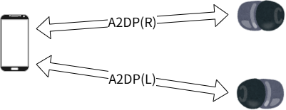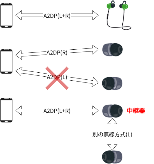 それでは、左右で別々にA2DPで接続できないとなると、どうやって左右独立型が無線接続しているのでしょうか?それは、右か左どちらかが「中継器」の役割を果たすようになっているのです。中継器側はスマホとはA2DPで接続し、左右両方の音が入った情報を受け取ります。そして、自分の音を抜いた逆側の音の信号を、別の無線方式で送っているのです。これは、一般にリレー方式と呼ばれ、A2DPが2台接続できないジレンマを解消する苦肉の策と言えると思います。