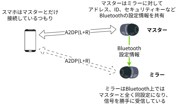 TWMのミラーリングは、当たり前ですが冗長性のためではなく、左右二つのイヤホンに同じデータをを送ることを言います。TWMを説明したのが下の図です。まず、スマホのような親機はマスターの機器と「普通に」接続します。しかし、マスターは、ミラーと通信をし、Bluetoothの接続設定を全て共有します。そのことで、ミラーは親機がマスター向けに送っている信号を全て受信(傍受?)出来るようになります。言い方を変えると、親機からのBluetoothの信号を受信するために、ミラーはアドレスやIDなどがマスターと同じになるように「擬態」するんです。もちろん、Bluetoothは周波数ホッピングですから、その周波数の変化も「擬態」します。さらに、Bluetoothの通信には暗号化もかかりますから、暗号化も「擬態」します。