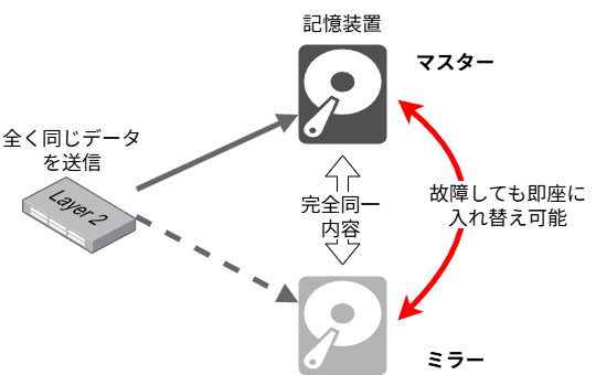 TWMは、”ミラーリング”と名付けられているとおり、サーバーとかでよく使われる技術であるミラーリングを参考にした技術です。ミラーリングとは、現在動いている機器と全く同じデータを受信している予備の機器をもう一台作り、バックアップ(冗長)とすることを言います。下の図は、全く同じデータを常時2つのストレージに記録させることで、仮に一台が故障してももう一台に記録が残るためデータが失われない、というミラーリングの例です。この方法はかなり広く使われています。記憶装置だけでなく、スイッチやルーターの冗長性を得るためにミラーリングが使われることも多いです。