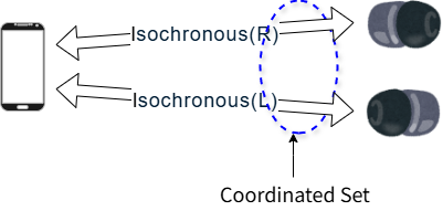 また、この複数のストリームを束ねるために、コーディネートセットという考え方も採用しています。図の通り、束ねられたストリームは”一つの機器群”に対する接続と認識されます。左右独立型イヤホンや補聴器の場合は2つの機器が一つのコーディネートセットとして認識されます。