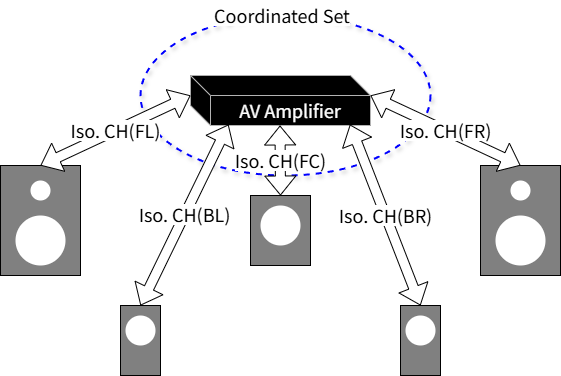 また、マルチストリームは3つ以上のストリームを同時に接続することも出来ます。例えば5chサラウンドスピーカーをLE Audioで接続することもでき、その場合は5つのアイソクロナスストリームを使います。そして、それらを1つのコーディネートセットにまとめ、1つの対象物として認識することが出来ます。