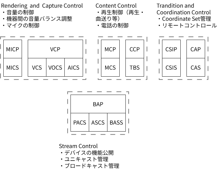 GAFでは、ある特定のプロファイルやサービスが単体で動作するわけではなく、互いが強調して動くように出来ています。この考え方を「マルチプロファイル」と呼びますが、これにより、Classic時代のように「あるプロファイルに対応しているか、していないかで機器を区別すること」は出来なくなりました。対応機器が、Classic時代のように”A2DP対応”のようなプロファイル単位の表記でなく、まるっとまとめて"LE Audio対応”という表記になるのはそのためです。