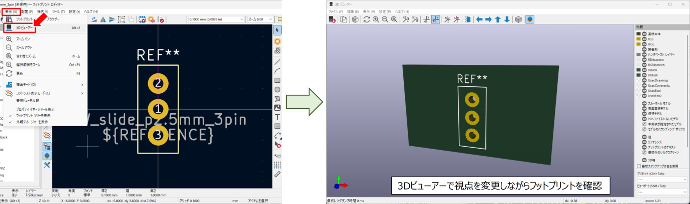 画面上部の「表示」をクリックしてメニューを展開し「3Dビューアー」をクリックします。作成中のフットプリントを元にしたイメージが表示されるので、視点を変更しながら意図した通りの構成となっているか確認しましょう。