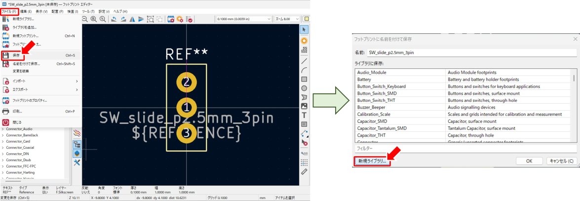 画面上部「ファイル」をクリックしてメニューを展開し「保存」をクリックします。「フットプリントに名前を付けて保存」という画面が開くので「新規ライブラリ」をクリックします。