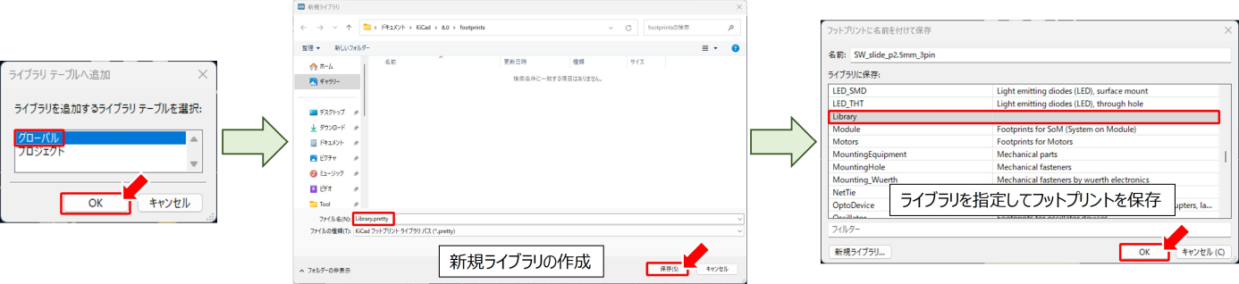 次回以降、新規フットプリントを保存する際は今回作成したLibraryに溜めることもできますし、部品の特性に応じてコネクターや抵抗といった機能ごとのライブラリを作成して管理することもできます。