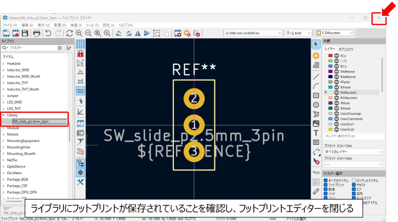 これでフットプリントを自作する一連の作業が完了しました。画面右上の✕をクリックしてフットプリントエディターを閉じます。
