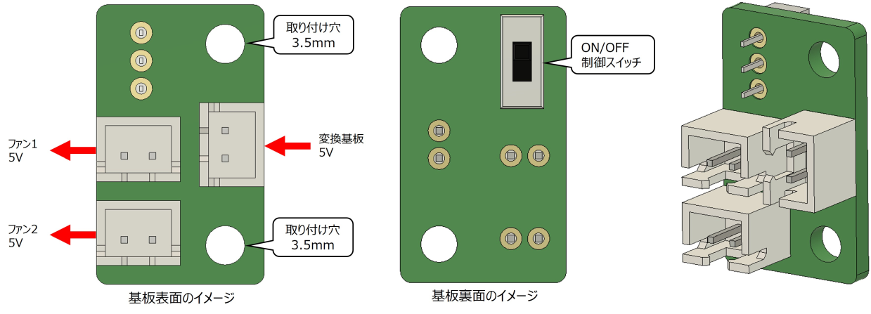 DC5Vの入出力用に2.5mmピッチのコネクターを基板表面に3個、ファン動作のON/OFF制御用にスライドスイッチを基板裏面に1個実装します。また、基板の取り付け穴としてΦ3.5mmの穴を2個設けます。