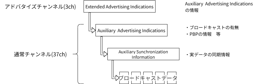 しかし、ブロードキャストにおいては常に親機が接続情報を報知し続けなければいけません。それなのに、3チャンネルしかなく、しかも常に混んでいるアドバタイズチャンネルに対して、ブロードキャスト用の接続情報を報知し続けてしまうと、無線リソース的に他の機器のペアリングを阻害しかねません。そのため、メインのブロードキャストチャンネルでは最小限の情報だけを報知しておいて、実際の細かい情報は通常チャンネルで送るという(面倒な)方式を採っています(下図)。