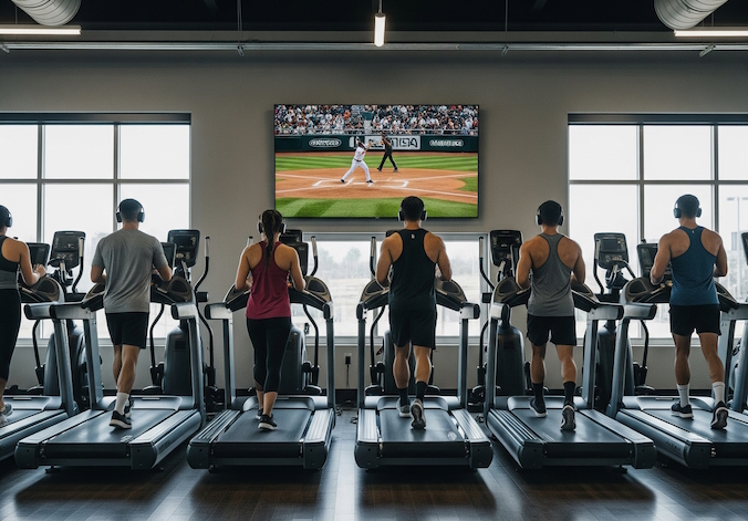 スポーツジムで特にトレッドミルやバイクのような有酸素運動系の機器のそばで、大画面にてスポーツ中継のようなテレビ放送が流れていることがあります。私も昔、箱根駅伝を見ながらトレッドミルでランニングをするという暴挙に出たことがあり、画面に映る選手と、運動不足のおっさんとのランニングスピードの違いに絶望したことがありました・・・ 話がそれてしまいましたが、通常スポーツジムの様な場所で大画面テレビに映像が流れていたとしても、当然ジム内にその音は流れておらず、画面の音声を聞く手段はありませんでした※10。しかし、ここでAuracastによりテレビの音をブロードキャストできれば、みんなが持っているヘッドホンで大画面テレビの音声を聞くことができるのです。もちろん、テレビには興味がなく自分の音楽を聴きたい人は、引き続きそうすれば良いだけ。自分が普段使っている機器を使って、聞きたい人だけにブロードキャストできる、これがAuracastです。