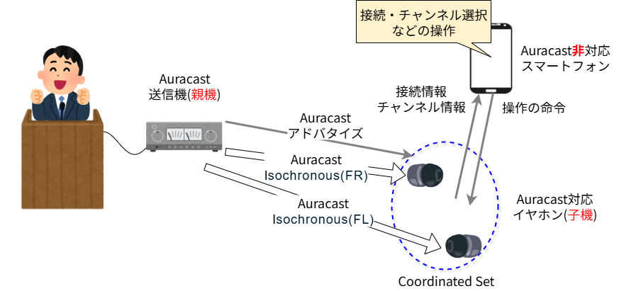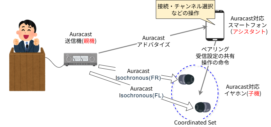 - Auracast送信機から出されるアドバタイズチャンネルを、実際に受信するイヤホンなどの子機ではなく、スマートフォンが受信します。このとき、スマートフォンはアシスタントと呼ばれます。