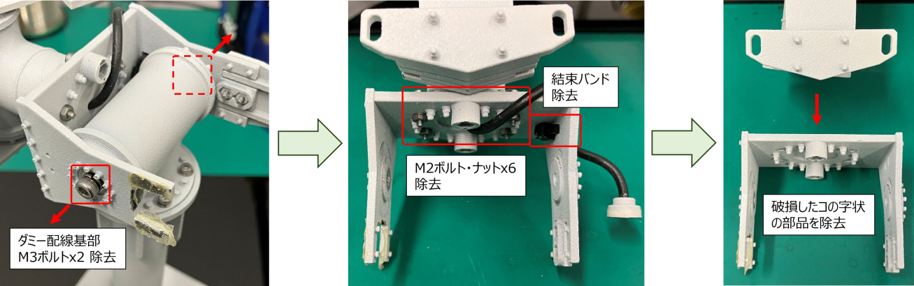 まずは可動軸兼固定用のM3ボルトに被せているダミー配線を抜いた後、露出したM3ボルト2本を抜き、破損したコの字状の部品を開きながら上下に分割します。