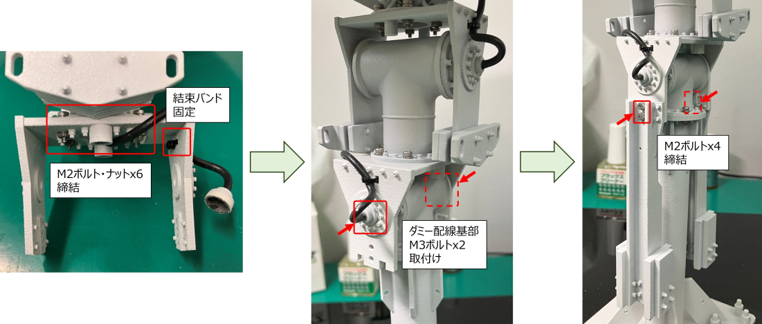 コの字状の交換部品をM2ボルト・ナット6式で締結し、ダミー配線を結束バンドで留めます。