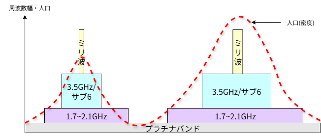 - 人が多くくて、それらでも混んできた場所には、次の周波数である3.5GHzやサブ6の基地局を建てる