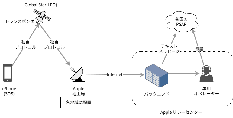 B: さらに、アップルはリレーセンターと呼ばれる衛星SOSの受信センターも作った。リレーセンターがAppleと各国のPSAPとの接続を担う。具体的には、SOSが上がってきた国のPSAPがテキストメッセージに対応していれば、そのまま該当国へテキストベースで通報。対応していなければ、Appleが用意した専用オペレーター(人間)が各国のPSAPへ音声電話を掛ける、そういった仕組みになっているようだ。